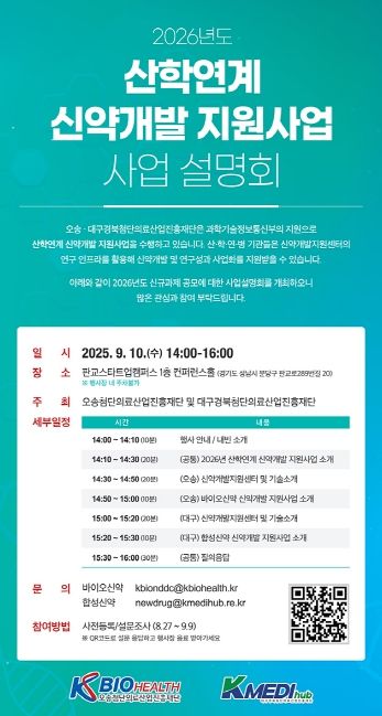 내고향뉴스 고광만 기자 | 케이메디허브 신약개발지원센터가 내달 10일 오후 2시, 경기스타트업캠퍼스 컨퍼런스홀에서 ‘2026년 산학연계 신약개발 지원사업 신규과제 설명회’를 개최한다.
