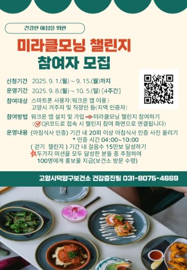내고향뉴스 고광만 기자 | 고양특례시 덕양구보건소는 균형 잡힌 식생활 실천과 건강생활습관 형성을 위해 오는 9월 8일부터 10월 5일까지 ‘미라클모닝 챌린지’를 운영한다고 밝혔다.