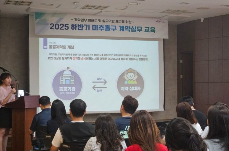 내고향뉴스 고광만 기자 | 인천 미추홀구(구청장 이영훈)는 29일 숭의보건지소 보건교육실에서 계약 담당자, 발주부서 담당자 등 70여 명을 대상으로 계약 업무 수행 전문성 향상과 역량 강화를 위한 ‘계약 실무교육’을 실시했다.
