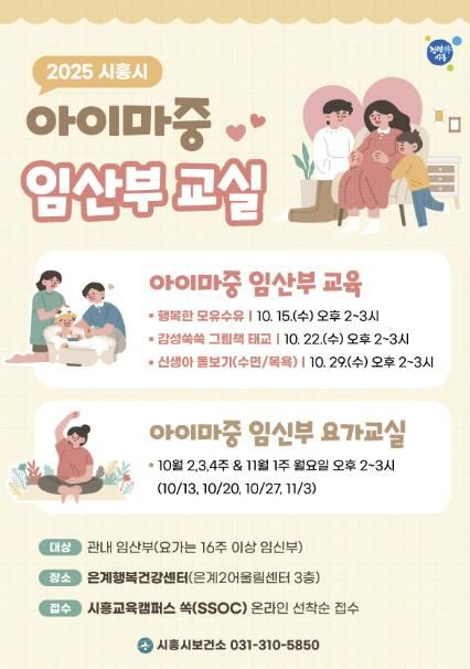 주요 교육 내용은 ▲임신부 요가교실(16주 이상 임신부 대상, 10월 2, 3, 4주 및 11월 1주 월요일) ▲수면, 목욕 등 신생아 돌보기(10월 29일) ▲그림책 태교(10월 22일) ▲행복한 모유 수유(10월 15일) 등으로 구성돼 있으며, 시흥시에 거주하는 임산부라면 누구나 참여할 수 있다.
