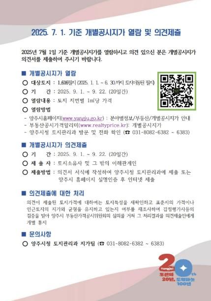 내고향뉴스 관리자 기자 | 양주시는 9월 1일부터 9월 22일까지 2025년 7월 1일 기준 개별공시지가 열람과 의견제출을 받는다.