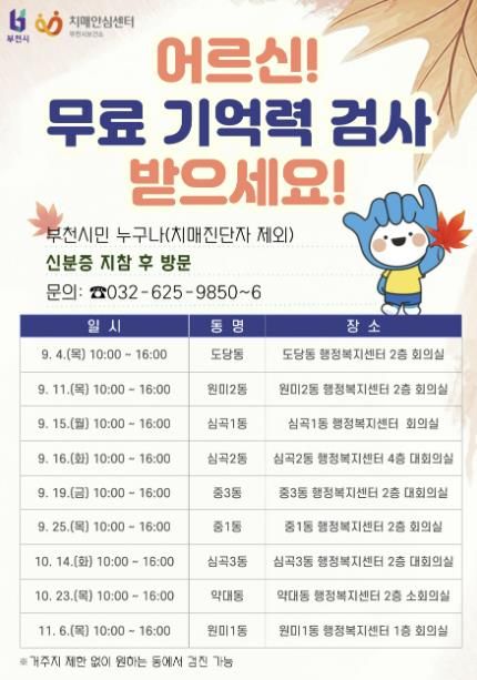 검진은 60세 이상 부천시민을 대상으로 하며, 부천시치매안심센터 전문 인력이 동 행정복지센터를 직접 방문해 1:1 인지선별검사를 진행한다. 검진을 원하는 시민은 신분증을 지참해 거주지 동과 관계없이 일정에 해당하는 행정복지센터를 방문하면 되며, 검사 비용은 전액 무료다.