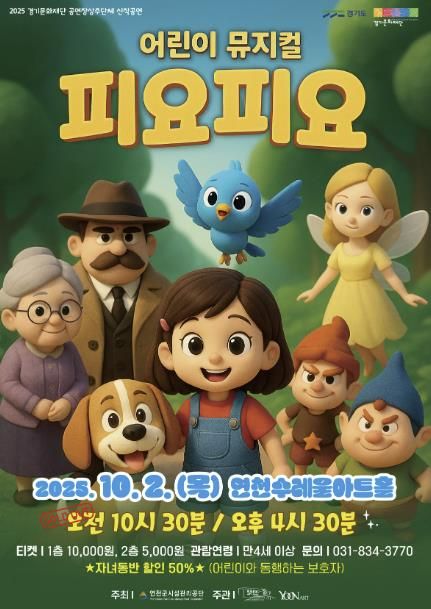 내고향뉴스 고광만 기자 | 연천수레울아트홀은 2025년 10월 2일 오전 10시 30분과 오후 4시 30분, 대공연장에서 어린이 뮤지컬 〈피요피요〉를 선보인다.