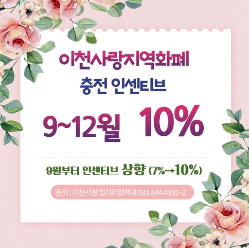 내고향뉴스 관리자 기자 | 이천시는 지역경제 활성화와 소상공인 매출 증대를 위해 오는 9월부터 12월까지 경기이천사랑 지역화폐 인센티브를 10%로 상향 지원한다고 밝혔다.