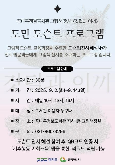 내고향뉴스 관리자 기자 | 동두천시 도서문화사업소 꿈나무정보도서관은 9월 14일까지 열리는 ‘깃털과 이끼’ 그림책 전시의 원활한 운영을 위해 전문적으로 양성된 ‘경기도민 그림책 도슨트’와 함께 전시 해설 프로그램을 진행한다.