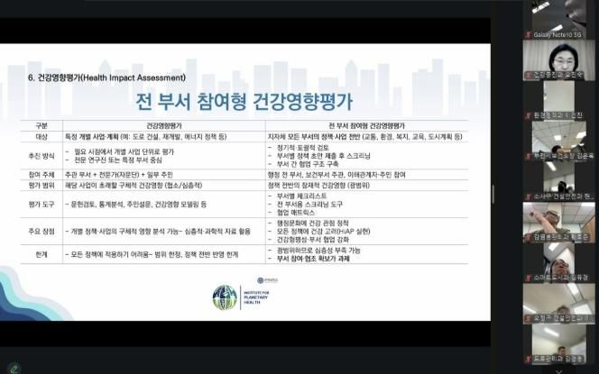 강의는 연세대학교 노진원 교수가 맡아 진행했으며, 건강도시 사업의 개념과 필요성, 건강도시지표 및 건강영향평가(HIA), 부서 간 협업 방안 등을 중심으로 진행됐다.