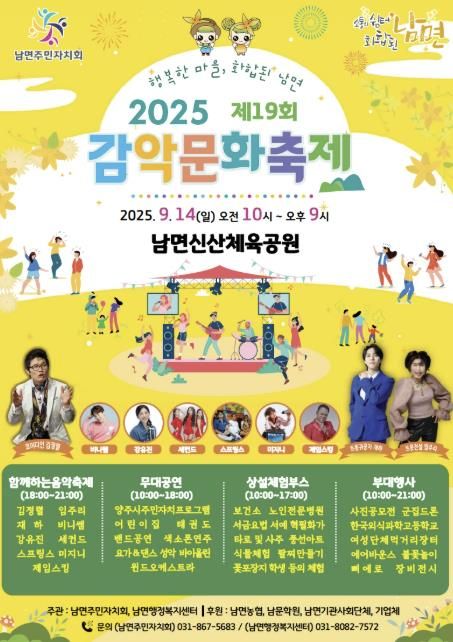 남면 주민자치회가 주관하는 이번 축제는 지역 기관·단체와 주민들이 자발적으로 참여해 고장의 아름다움과 감악산의 매력을 알리기 위해 준비 중이다. 특히 예년보다 더욱 풍성한 볼거리와 즐길 거리를 마련해 방문객들에게 다채로운 즐거움을 선사할 예정이다.