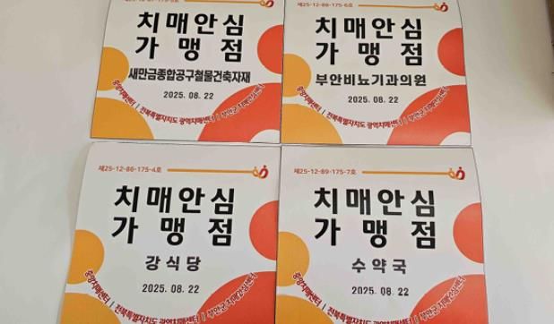 내고향뉴스 고광만 기자 | 부안군은 치매 걱정 없는 치매안심마을 조성을 위해 지난 2020년부터 현재까지 한의원, 약국, 미용실, 안경점 등 36개소를 치매안심가맹점를 지정했으며 올해에는 치매안심마을 부근 부안읍과 행안면에 4개소를 추가 지정하고 지난 1일 현판을 전달했다고 밝혔다.