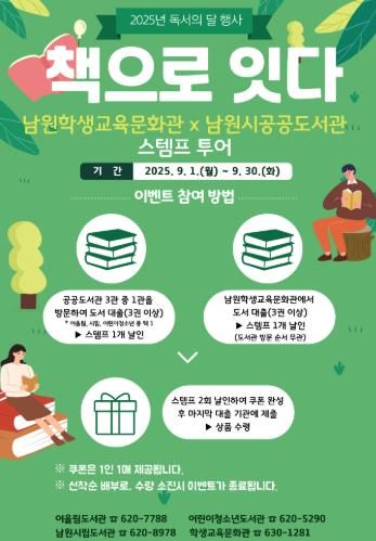 내고향뉴스 고광만 기자 | 남원시는 독서의 달을 맞아 9월 2일부터 30일까지 남원시공공도서관(어울림·시립·어린이청소년)과 남원학생교육문화관이 함께하는 상호 교류 도서 대출 이벤트를 운영한다고 밝혔다.