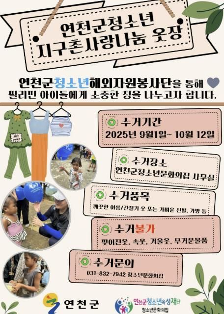 지구촌 사랑 나눔옷장 프로젝트는 2025년 9월 1일(월)부터 10월 12일(일)까지 헌옷을 기증 청소년문화의집에서 받으며, 세탁 및 상태 양호한 의류를 기증받아 10월 28일(화) 필리핀 몬탈반 빈민촌 방문 시 직접 전달 예정이라 밝혔다.