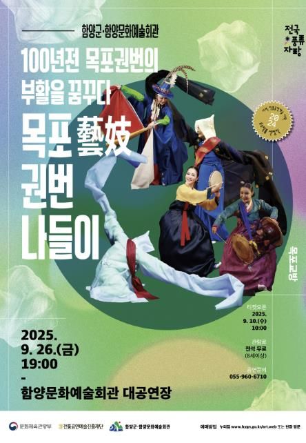 내고향뉴스 고광만 기자 | 함양군문화예술회관은 오는 9월 26일 오후 7시, 대공연장에서 ‘100년 전 목포권번의 부활을 꿈꾸다. - 목포 예기 권번 나들이’ 공연을 개최한다고 밝혔다.