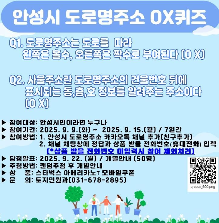 내고향뉴스 관리자 기자 | 안성시는 9월 9일부터 9월 15일까지 7일간 ‘도로명주소 OX퀴즈 이벤트’를 진행한다.