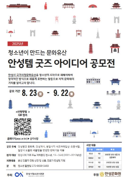 공모는 안성시 국가지정문화유산으로 등록되어 있는 문화재 △안성향교 풍화루 △안성객사 △ 봉업사지 석조여래입상·오층석탑 △칠장사 오불회괘불탱을 재조명한 굿즈 아이디어(디자인)를 주제로 한다.