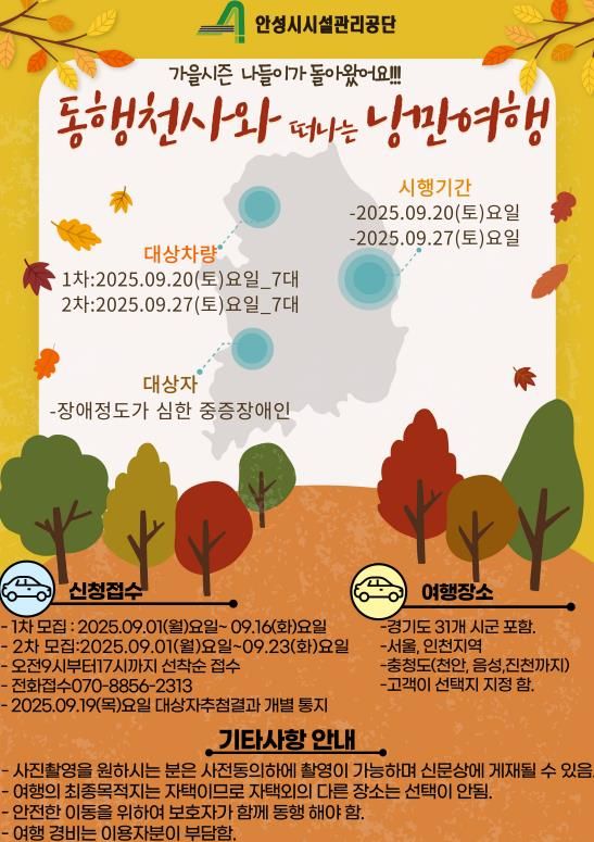 내고향뉴스 관리자 기자 | 안성시시설관리공단 교통약자지원팀 ‘동행천사’는 오는 9월 20일 토요일과 9월 27일 토요일 이틀간 가을 여행시즌을 맞아 차량지원(유료) 서비스 ‘동행천사와 떠나는 낭만여행’을 실시한다고 밝혔다.