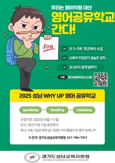 내고향뉴스 고광만 기자 | 경기도성남교육지원청은 9월부터 11월까지 성남다움 공유학교의 일환으로 '2025 성남 WHY UP 영어공유학교'를 운영한다. 사교육 의존도를 낮추고 학교 현장에서 양질의 영어 학습 기회를 제공하기 위해 기획됐다. 영어공유학교 거점학교에 소속된 교원과 전문 강사 등 영어교육 전문가들이 직접 운영한다. 대상은 초등학교 3학년부터 중학교 3학년으로 경기공유학교 온라인 시스템으로 참여 학생을 모집했다.