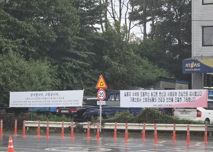 내고향뉴스 관리자 기자 | 지난 7월20일 집중호우로 발생한 매몰 및 실종사고와 관련하여 실종자 가족들이 가평소방서 앞에 감사의 마음을 담은 현수막을 게시해 주위를 훈훈하게 하고 있다.