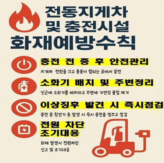 이번 대책은 단순한 장비관리 수준을 넘어, 산업현장의 사각지대까지 살피려는 선제적 대응의 일환이다. 최근 파주시에서는 전동지게차 충전 중 발생한 화재가 연이어 발생하고 있으며, 특히 대형 판매시설이나 랙크식 물류창고 등 가연물이 밀집된 공간에서는 화재 확산 위험이 높아 사전 예방의 중요성이 커지고 있다.