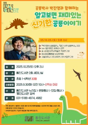 이 강의는 9월 30일 오전 10시부터 통진도서관 홈페이지에서 신청할 수 있으며, 공룡에 관심있는 초등학생(1~6학년) 30명을 선착순으로 모집한다.