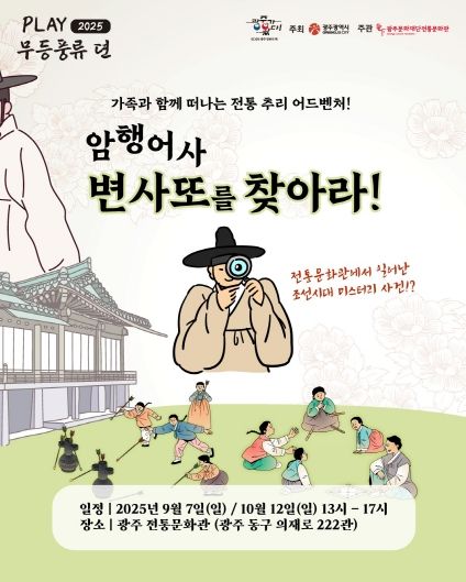 내고향뉴스 고광만 기자 | 광주문화재단(대표이사 노희용) 전통문화관은 오는 9월 7일 오후 1시, 전통문화관에서 2025년 세 번째 ‘PLAY 무등풍류 뎐’ 프로그램을 개최한다. 이번 행사는 '조선으로의 시간여행-암행어사, 변사또를 찾아라!'라는 주제로, 관람객들에게 조선시대 마을의 일상을 생생히 체험할 수 있는 몰입형 역사 콘텐츠를 선보인다.
