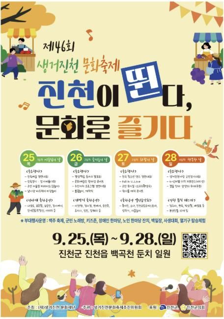 내고향뉴스 고광만 기자 | 충북 진천군 대표 문화예술축제인 ‘제46회 생거진천문화축제’가 ‘진천이 뛴다! 문화로 즐기다!’라는 주제로, 오는 9월 25일부터 28일까지 진천읍 백곡천 둔치 일원에서 성대하게 개최된다.