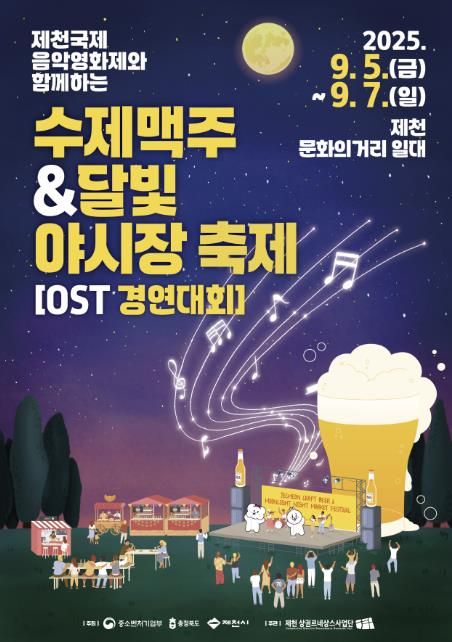 축제장에는 제천 지역 상인이 운영하는 20여 개 먹거리 부스와 특산품 수제맥주 ‘제천맥주’, 다양한 간식이 준비된다. 또 달빛정원 무대에서는 OST 경연대회와 초대가수 공연, 지역 가수들의 버스킹이 열려 시민과 방문객들에게 잊지 못할 가을밤을 선물한다.