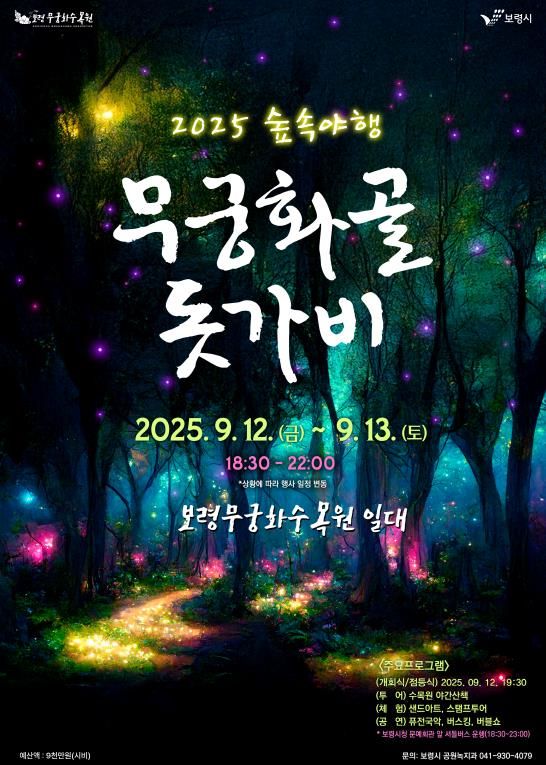 내고향뉴스 고광만 기자 | 보령시는 2025 숲속야행 ‘무궁화골 돗가비’ 행사를 오는 9월 12일부터 13일까지 2일간 보령무궁화수목원 일원에서 개최한다고 밝혔다.