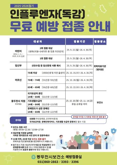 내고향뉴스 관리자 기자 | 동두천시는 오는 9월 22일부터 내년 4월 30일까지 인플루엔자(독감) 국가예방접종을 순차적으로 실시한다고 밝혔다.