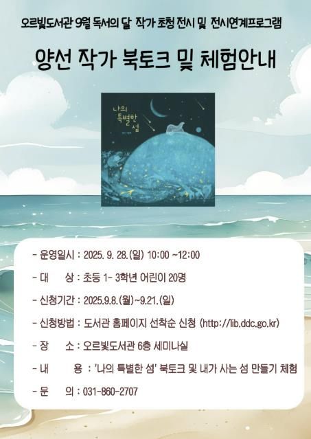 북토크와 체험 프로그램은 9월 28일 6층 세미나실에서 열린다. 초등 1~3학년을 대상으로 그림책 함께 읽기, 작가와의 질의응답, ‘내가 사는 섬 만들기’ 체험 활동이 진행돼 어린이들이 직접 창의력을 발휘할 수 있는 기회를 제공한다.