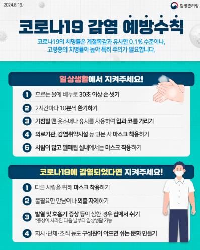 특히, 고령층, 면역저하자 등 고위험군은 밀폐된 실내에서 많은 사람이 모이는 장소·행사 참여 자제, 밀폐된 실내에서 마스크 착용, 발열 및 호흡기 증상 시 인근병원에서 신속하게 진료를 받아야 한다.