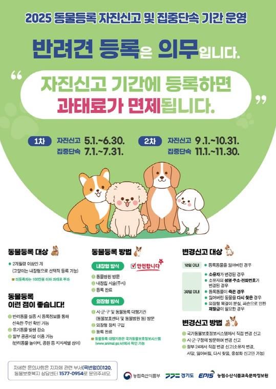 내고향뉴스 관리자 기자 | 의정부시는 9월 1일부터 10월 31일까지 ‘2025년 동물등록 자진신고 기간’을 운영하고, 이어 11월 1일부터 30일까지 집중단속을 추진한다.