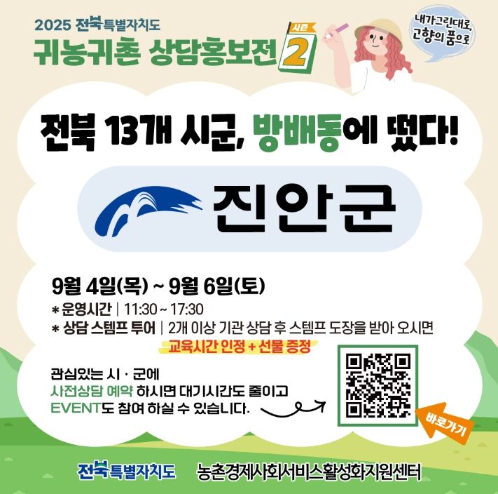 센터 관계자는 “이번 상담홍보전을 통해 진안군의 정책과 정주 여건을 효과적으로 알리고, 예비 귀농귀촌인들이 안정적으로 정착할 수 있도록 적극 지원하겠다”며 “사전상담예약을 통해 더 많은 분들이 편리하게 상담 기회를 얻길 바란다”고 밝혔다.