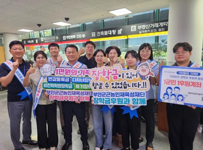 한편, 부안군근농인재육성재단은 반값등록금, 다자녀장학금, 특기장학금, 대학 비진학자 취업‧창업 학원비 지원 등 다양한 장학사업을 통해 지역청년들에게 희망을 전하고 있으며, ‘장학금 1군민 1후원계좌 갖기’ 운동을 통해 군민 모두가 후원자가 되는 나눔 문화를 확산해 나가고 있다.