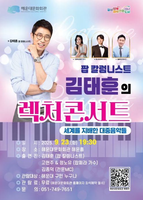 내고향뉴스 고광만 기자 | 해운대문화회관은 23일 오후 7시 30분 해운홀에 서 ‘팝 칼럼니스트 김태훈의 렉처콘서트’를 개최한다.