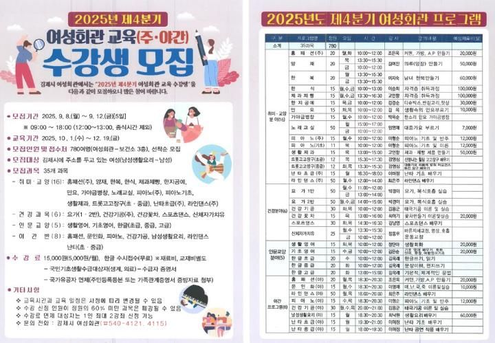 내고향뉴스 고광만 기자 | 김제시는 여성회관이 오는 8일부터 12일까지 여성의 건전한 여가 활동을 지원하고 여성의 잠재능력 개발과 경제력 향상 및 자아실현으로 여성의 행복을 추구하고, 평생교육을 통해 여성의 역량을 강화하고자 2025년도 제4분기 여성회관 수강생을 모집한다고 밝혔다.
