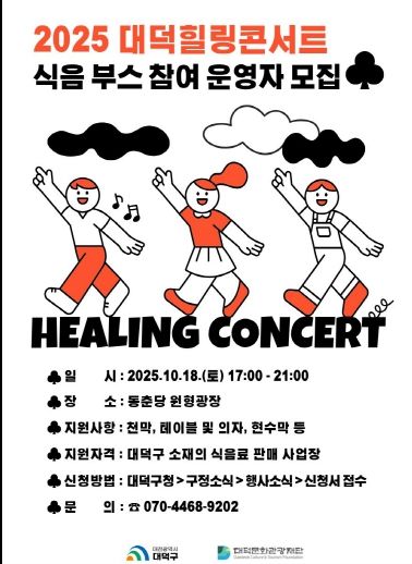 한편, 대덕힐링콘서트는 지난해 약 1000여 명이 찾는 등 공연과 부스 운영 모두에서 호응을 얻었으며, 올해는 더욱 다채로운 공연과 지역민 참여 확대를 통해 업그레이드된 힐링 축제를 선보일 예정이다.