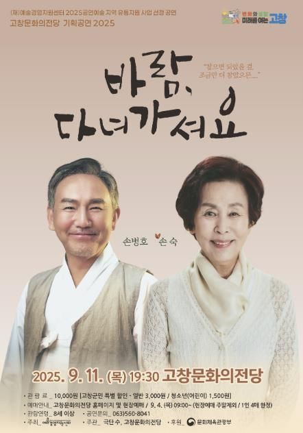 내고향뉴스 고광만 기자 | 고창문화의전당이 손숙·손병호 주연의 연극 ‘바람, 다녀가셔요’ 공연을 오는 11일 저녁 7시30분에 무대에 올린다.