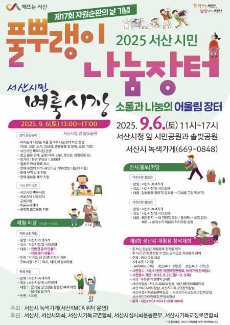 내고향뉴스 고광만 기자 | 충남 서산시가 제17회 자원순환의 날을 기념하며 오는 6일 오전 11시부터 오후 5시까지 솔빛공원에서 풀뿌랭이 나눔장터를 개최한다고 밝혔다.