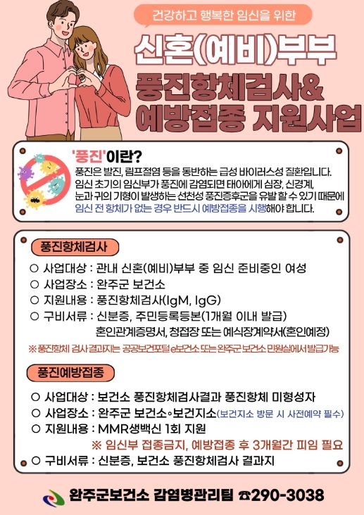 내고향뉴스 고광만 기자 | 완주군이 건강하고 안전한 임신을 돕기 위해 신혼(예비)부부 여성을 대상으로 풍진 항체검사와 예방접종 지원사업을 실시한다.