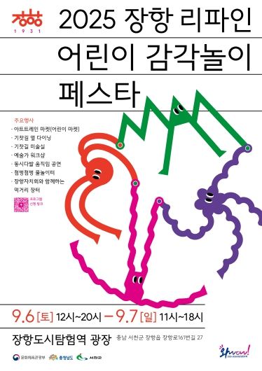 행사 기간 동안 장항 리파인 공간에서는 △어린이마켓 △첨벙첨벙 물놀이 △기찻길 미술실 △예술가 워크숍 △거리 퍼포먼스 △지역 공연팀 무대 △장항주민자치회 먹거리 장터 등 다채로운 프로그램이 마련된다.
