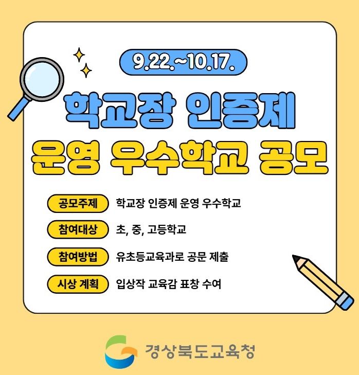 공모 신청은 9. 22. ~ 10. 17.까지 경상북도교육청 유초등교육과로 공문으로 제출하면 된다.