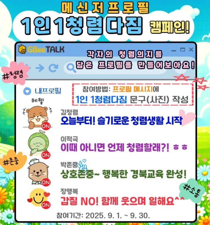 내고향뉴스 고광만 기자 | 경북교육청은 9월 한달 간 쉽고 즐겁게 참여할 수 있는 ‘메신저 프로필 '1인·1청렴다짐' 캠페인’을 실시한다고 8일 밝혔다.