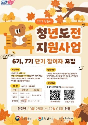내고향뉴스 고광만 기자 | 정읍시 청년지원센터가 청년들의 진로 탐색과 구직 역량 강화를 돕기 위한 ‘2025 청년도전지원사업’ 단기과정 참여자를 모집한다.