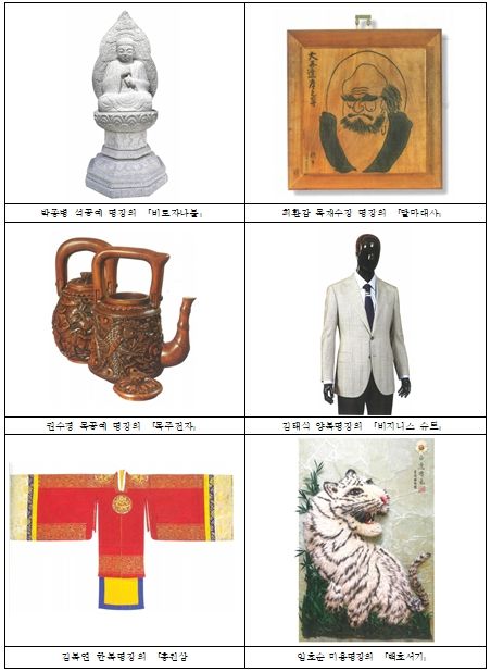 박종병 석공예 명장의 ‘비로자나불’, 최환갑 목재수장 명장의 ‘달마대사’, 권수경 목공예 명장의 ‘목주전자’, 김태식 양복 명장의 ‘비지니스 슈트’, 김복연 한복 명장의 ‘홍원삼’, 임호순 미용 명장의 ‘백호서기’ 등 전통문화를 계승한 재현 작품부터 현대 감각에 맞게 제작한 명품까지, 명장들의 과거와 현재를 아우르는 숭고한 장인정신과 인내의 숨결을 감상할 수 있다.