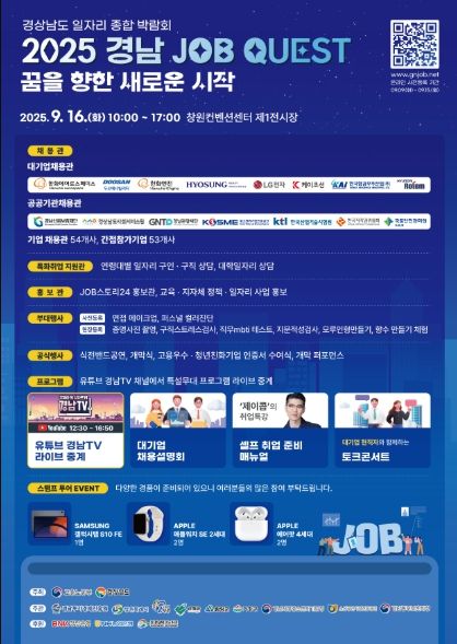 2025년 경남 일자리 종합박람회:JOB QUEST는 오는 16일 10시부터 17시까지 창원컨벤션센터 제1전시장에서 개최된다.