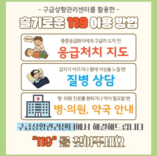 119구급상황관리센터는 연중무휴 24시간 운영되며, 중증 응급환자발생 시 구급차가 도착하기 전 필요한 응급처치 안내해 ‘골든타임’을 확보하는 데 중요한 역할을 하고 있다. 또한, 갑작스러운 통증이나 신체 이상 시 질병 상담을 지원하고, 병·의원 및 약국 위치 안내 서비스를 통해 시민들이 빠르고 정확하게 의료 서비스를 받을 수 있도록 지원한다.
