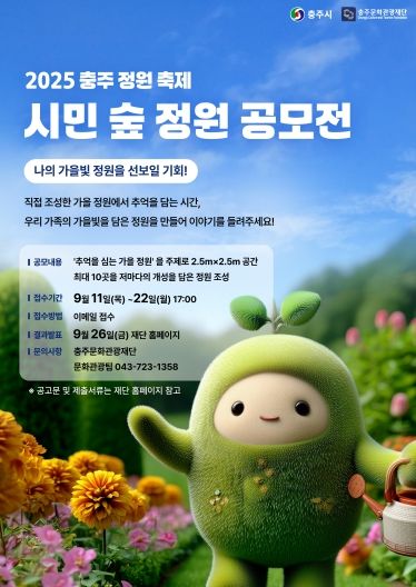 내고향뉴스 관리자 기자 | 충주시가 주최하고 (재)충주문화관광재단이 주관하는 ‘2025 충주 정원 축제’에서 ‘추억을 심는 가을 정원’을 주제로 시민 숲 정원 공모전을 개최한다고 밝혔다.