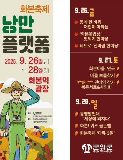 첫날(9.26)은 관내 유치원생 73명이 참여하는 ‘동네 한바퀴 어린이 마라톤’과 레트로 감성의 ‘신바람 한마당’, 미리 맛보는 ‘화본꽃밥상’이 펼쳐진다. 둘째 날(9.27)은 마을 주민들의 신파극 공연 ‘이별의 화본정거장’, 마을 보물찾기, 전통놀이 ‘옛날 옛적 올림픽’이 준비돼 있다. 마지막 날(9.28)에는 마을의 소리를 담은 ‘동행발언대’, ‘화본 퀴즈 골든벨’, 자연과 함께하는 플로깅, ‘다큐 3일’ 특별 상영으로 마무리된다. 특히 베스트셀러 『덕혜옹주』의 권비영 작가 북토크 등 인문학 콘텐츠도 마련돼 축제의 깊이를 더한다.