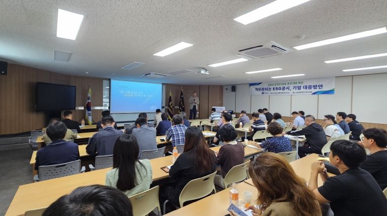 이번 특강은 김용수 한국 ESG 학회 부회장을 초청해 단계적으로 의무화되는 ESG(환경·사회·지배구조) 공시 제도에 대비하고, 지역 중소기업의 이해를 도와 실질적인 대응 방안을 모색하기 위해 마련됐다.