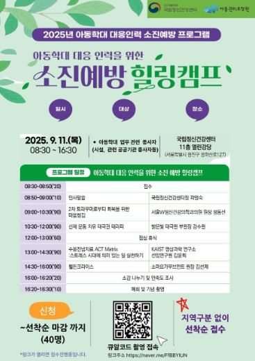 9월 11일(목)에는 국립정신건강센터 11층 열린강당(서울시 광진구)에서 아동학대 대응인력 직무 스트레스에 따른 심리·정서적 소진 예방과 자기돌봄 능력 강화를 위해 '아동학대 대응인력 소진예방 힐링캠프'를 개최한다.