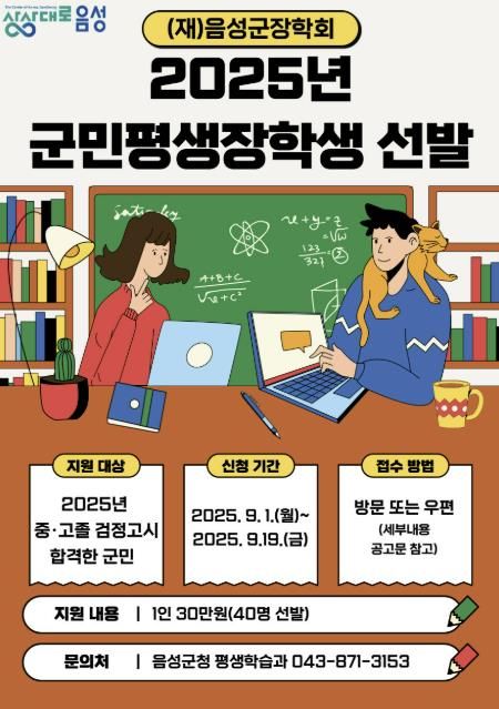 군 장학회는 2025년에 시행된 중졸 또는 고졸 검정고시에 합격한 음성군민 40명을 선발을 선발해 1인당 30만원의 장학금을 지급할 계획이다.